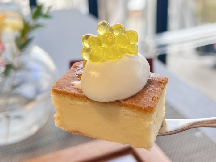 「チーズケーキ」は、オリーブオイルを閉じ込めたキャビアロリがのった大人のスイーツ。口に入れるとオリーブオイルの香りが広がり、濃厚なチーズと絶妙にマッチします。