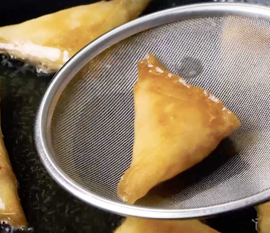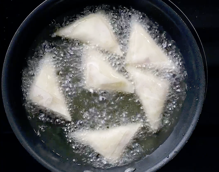 5: フライパンにサラダ油を深さ2cmほど入れ170℃に熱し、④を入れます。両面がカリっと揚がったら完成です。