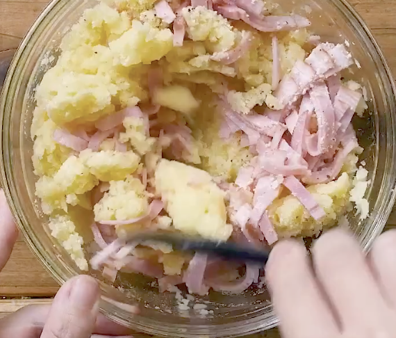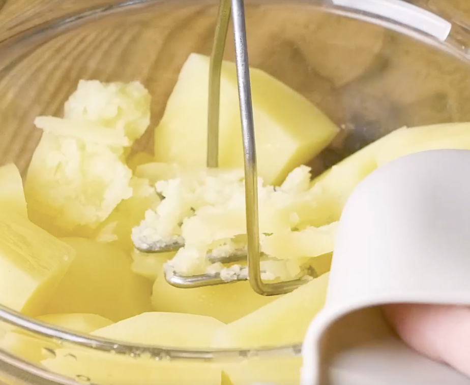 2: 取り出したらマッシャーで潰し、 【a】の材料を加えて混ぜ、しっかりと冷まします。
