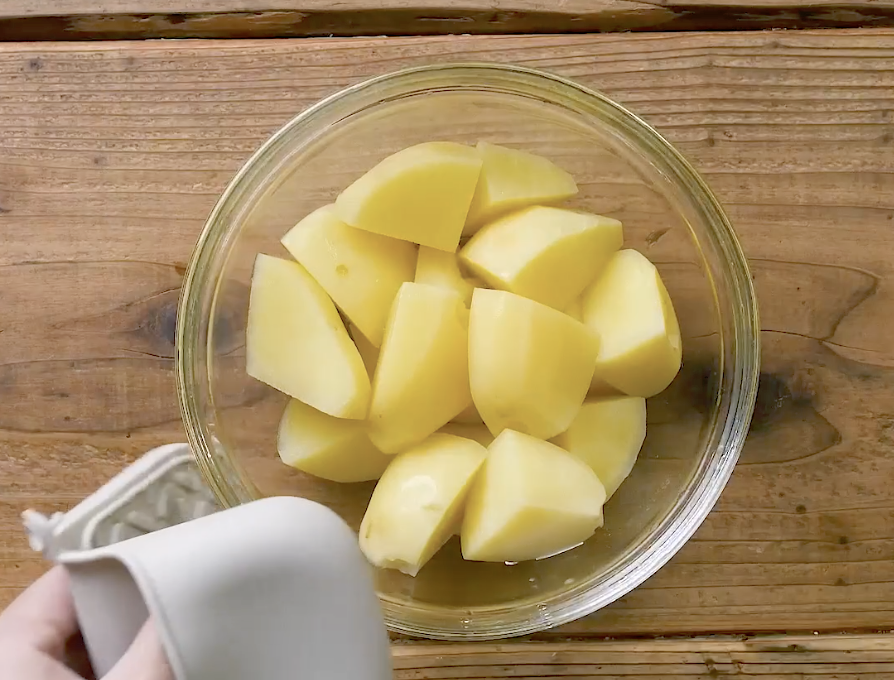 1: 耐熱ボウルにじゃがいもを入れ、ラップをかけてレンジ600Wで5〜6分加熱します。
