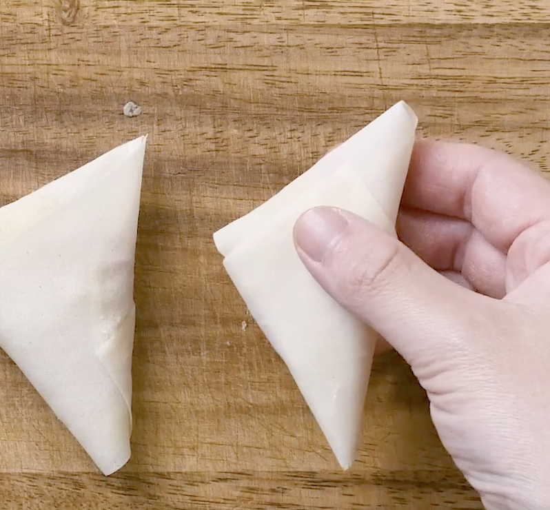 4: 三角になるようにパタパタと折りたたみながら巻き、巻き終わりを水溶き小麦粉で止めます。