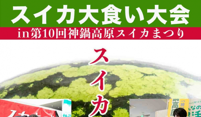 毎年人気の同イベントで、注目のスイカ大食い大会は参加には、事前のWeb申し込みが必要。大会は予選と本選の2段階で行われ、予選は13時から小玉スイカの種箸取り競争(制限時間2分)で競い、男女各10名が本選に進出します。本選は14時から1分間のスイカ大食いで食べた量を競い、男女別の優勝者には神鍋高原特産詰め合わせセットが贈られます。