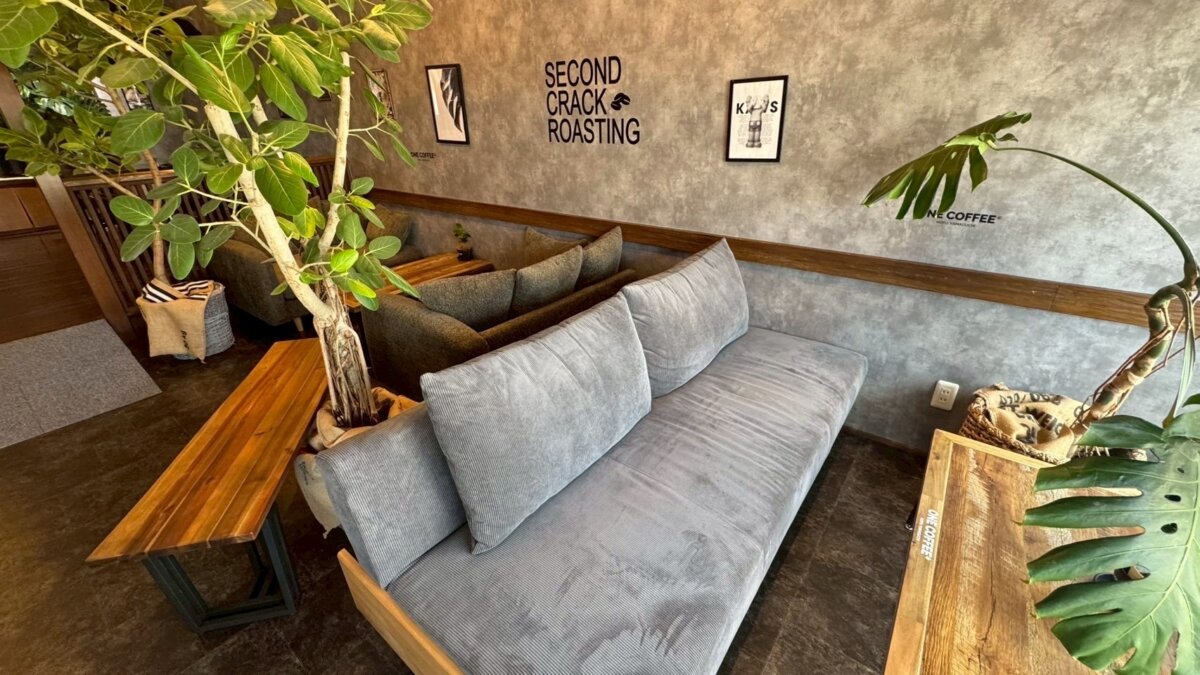 グレーの壁には焙煎のこだわりを表す「SECOND CRACK ROASTING」の文字があしらわれ、ぬくもりある木の家具、観葉植物のアクセントが程よく調和しています。