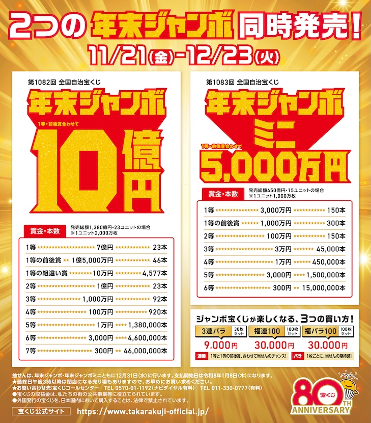 2025年は宝くじ80周年の記念イヤー!年末ジャンボの発売期間に合わせて、宝くじ売り場と宝くじ公式サイトそれぞれでプレミアムキャンペーンが実施されます。