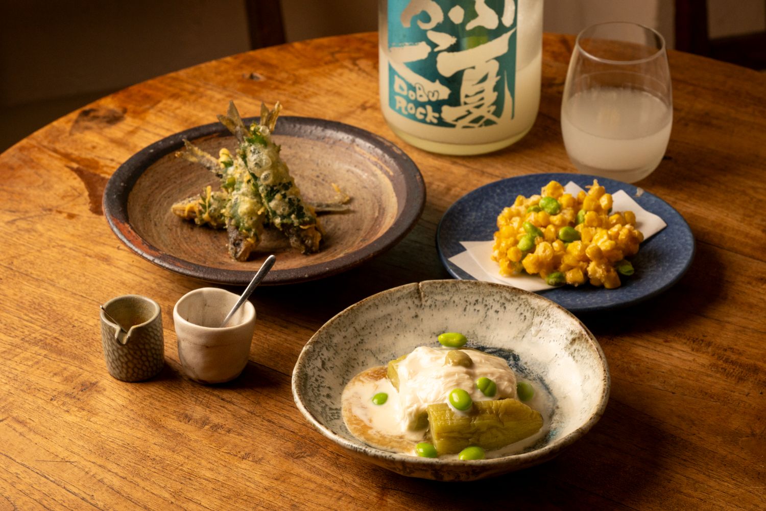 店主の村田大輔さんは和食を、女将の由美子さんは異国料理を担当。創作天ぷらを主軸とする旬な食材を用いた肴と、エスニック要素のある多彩な一皿料理に、ナチュラルワイン、日本酒、焼酎をクロスオーバーして合わせていく。「新メニューのヒントはいつも旅の記憶から。去年はタイに行ったので今はタイ料理が多め。今年の夏は台湾に行ってきます」と、由美子さん。中央線カルチャーを感じさせる店内と、2人の肩の力が抜けた接客が心地良い。