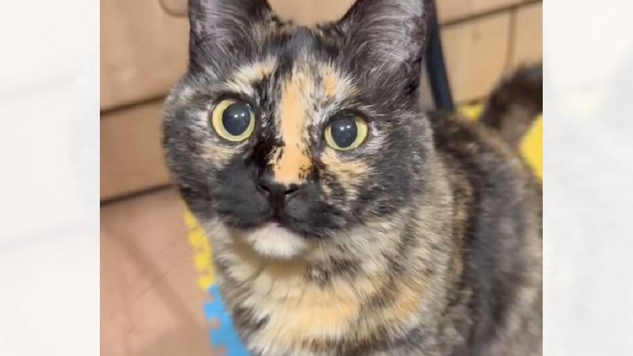 TikTokアカウント『mokomy』に投稿されたのは、マンチカンとエキゾチックショートヘアのミックス猫「うめこ」ちゃんの姿。短い足と目力がチャームポイントの女の子です。