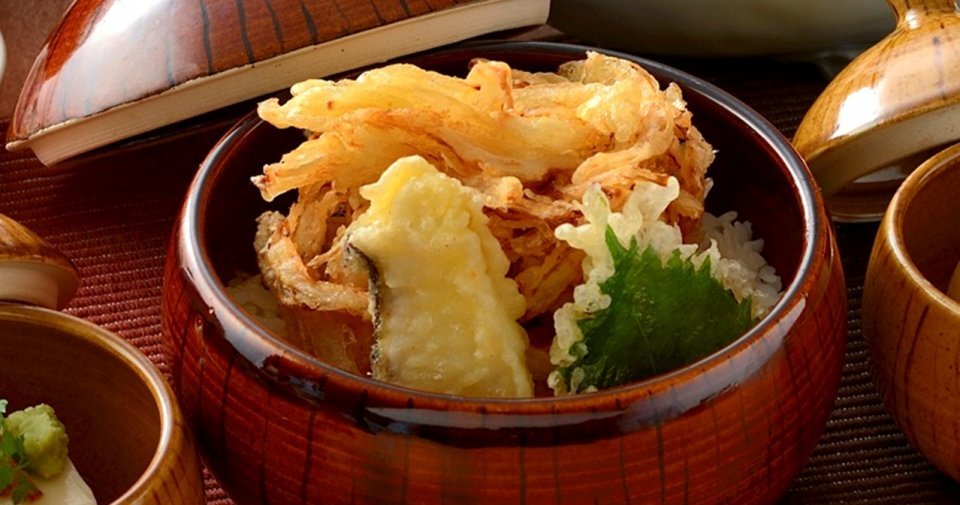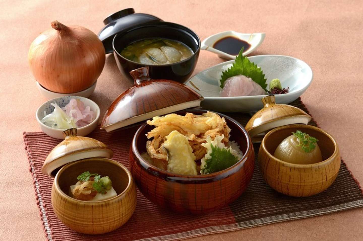 タマネギのかき揚げを使った天丼に、自家製のタマネギ豆腐、丸ごとタマネギの煮物など、淡路島のタマネギをふんだんに使用した御膳だ。