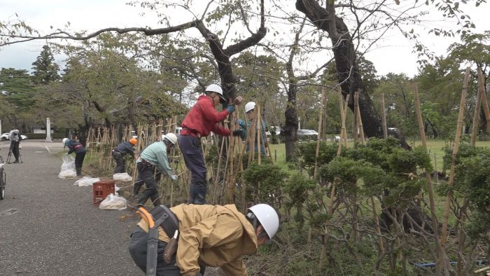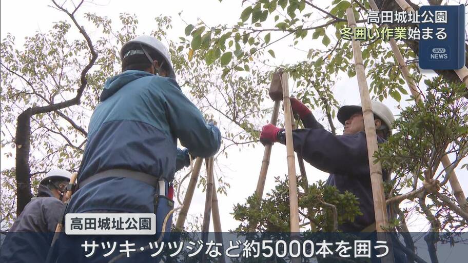 朝晩を中心に寒さを感じる日が増えてきました。高田城址公園では、冬を前に雪の重みで木が折れるのを防ぐ樹木の冬囲いが21日(火)から始まりました。