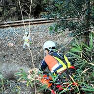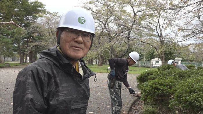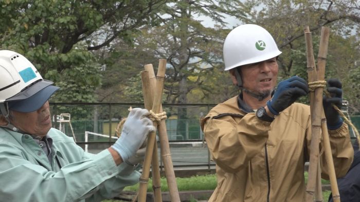初日は忠霊塔前の芝生広場でシルバー人材センターの作業員や市の職員など11人が、サツキやツツジの木を竹で囲って縄で縛っていきました。
