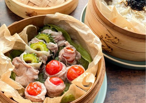 今回はゴーヤとミニトマトを使用しましたが、旬の野菜や冷蔵庫の余りものでもOKです。お肉の部位を変えれば、よりヘルシーに楽しめます。塩こんぶとえのきを加えたごはんを一緒に蒸せば、簡単に一食分の献立が完成しますよ。