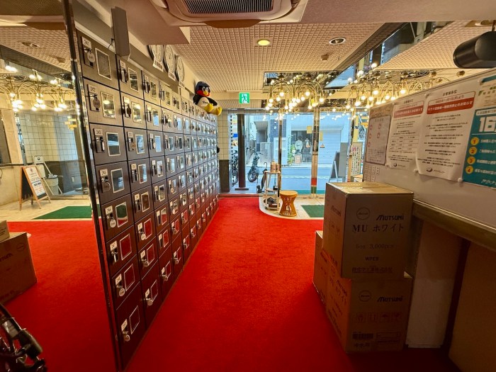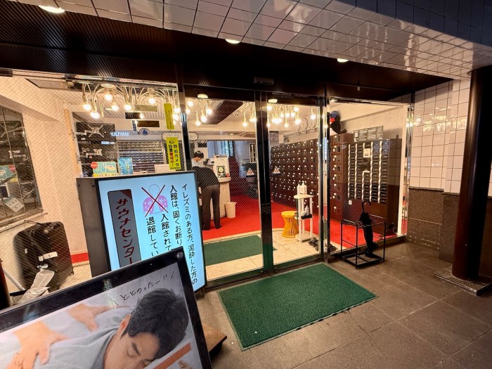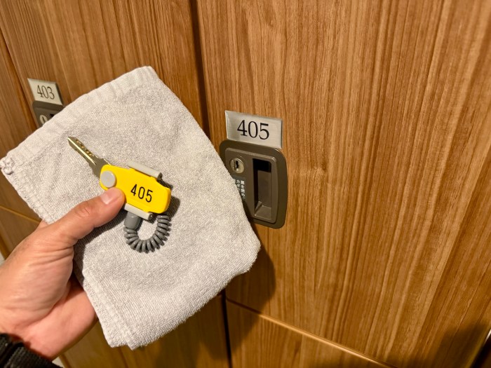 いざ近づいてみると、老舗感の漂う外観で周りには外国人御用達のスーパーも多く、なんとなく海外1人旅のような気分が味わえる。この日のチェックインは23時過ぎ。フロントで手続きを済ませてロッカーキーとフェイスタオルを受け取ったらロッカーへ。