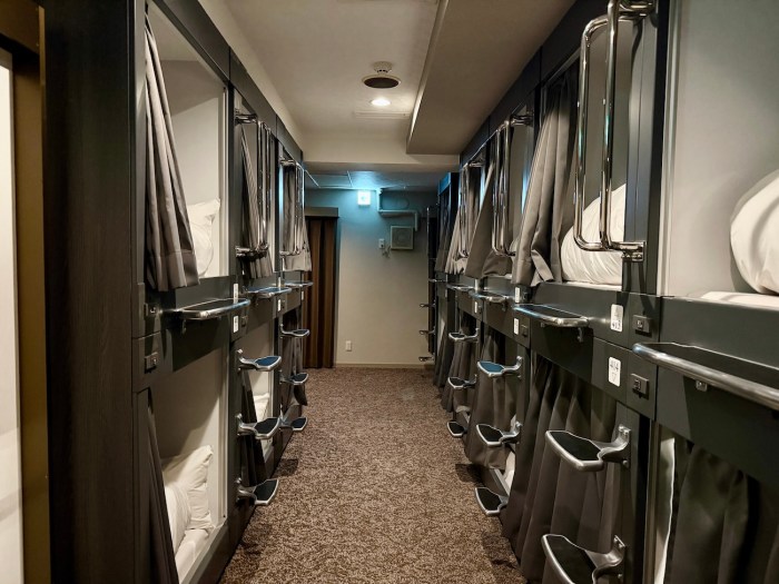 2025年8月にリニューアルされたカプセルエリアは雑魚寝スタイルから一転、キレイなカプセルが並んでいた。昭和レトロなクリーム色ではなく、スタイリッシュなグレーのカプセルは清潔感も感じられる。