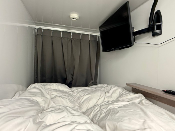 予約した上段のカプセルに入ってみると、思っていたよりも広い。テレビ・コンセント・USB充電ポートを完備。