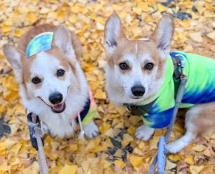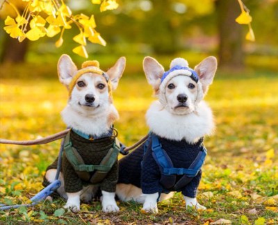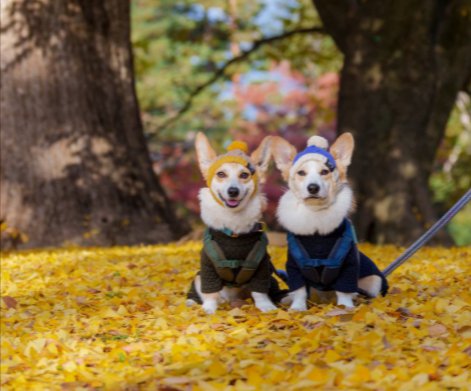 紅葉の絨毯の上で飼い主さんを見上げるコーギー兄弟