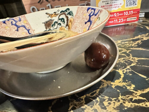 大将から 「サービスしといたけん」と言われてたのですが、どんぶりをカウンターに上げるときに発見! 「栗!」 これは気づかんて!おいしくいただきました。 9月1日にオープンしたばかりの「大阿蘇ラーメン火の国」