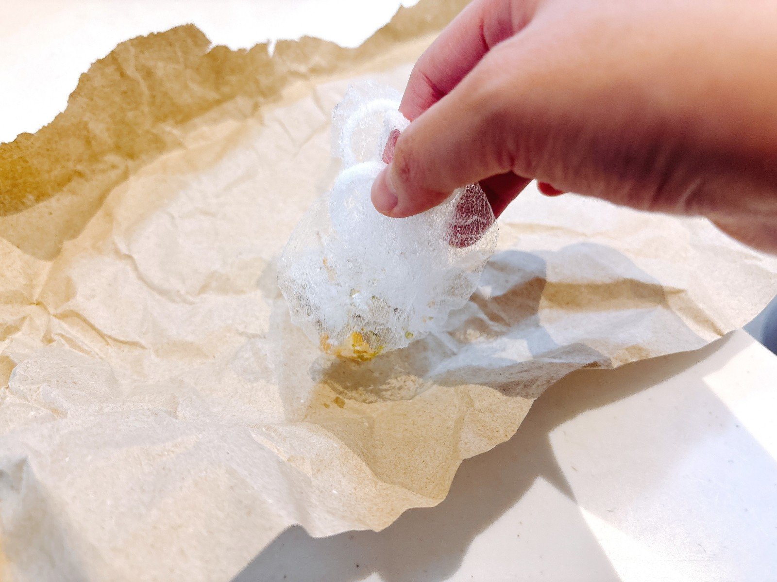 排水口ネットに溜まったごみを紙で包み、ポリ袋で二重にすると臭いや水気が漏れにくくなります。ポリ袋に直接生ごみを入れると底に水分が溜まりますが、紙を入れると吸い取ってくれるんです。