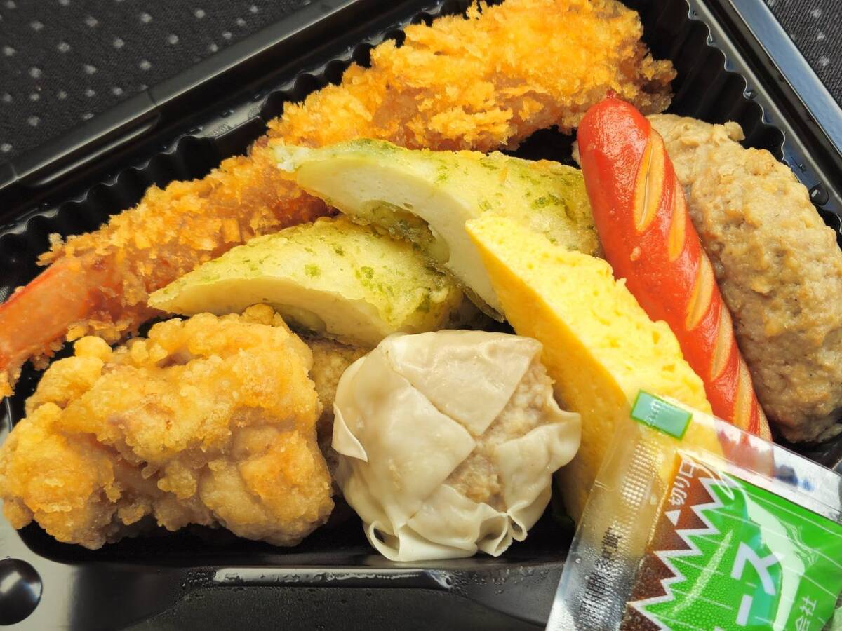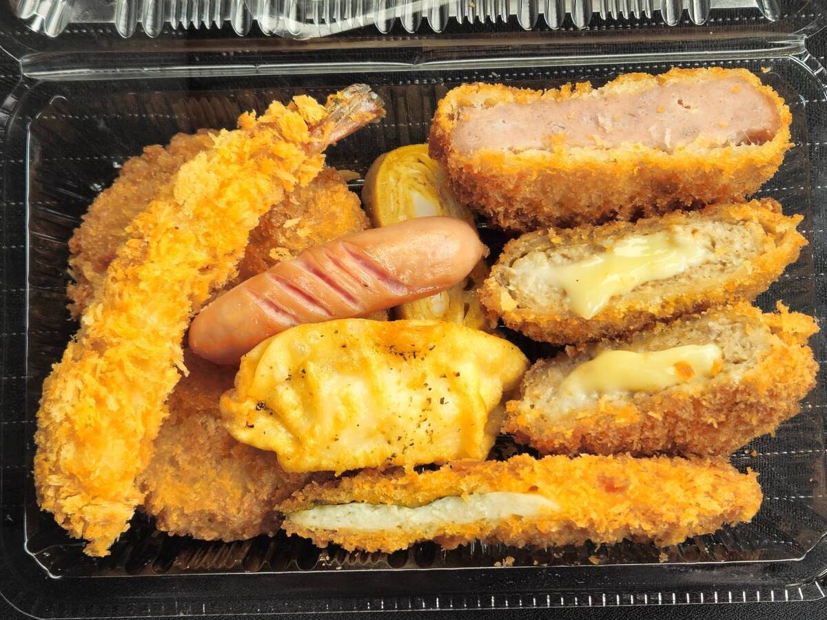 ハムカツ、チーズメンチカツ、大葉ササミフライ、エビフライ、牛すじコロッケ、たまご焼き、ウインナーと大ボリューム。