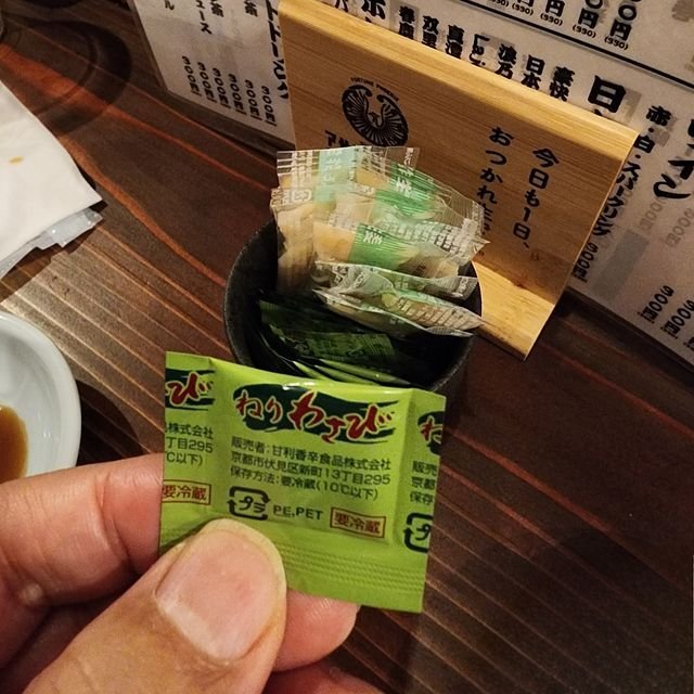 テーブル上には、御覧の我が街伏見区は甘利香辛食品謹製「小袋入り練りワサビ」が一杯置いてあるでお好きなだけ!という作戦。お味的には美味しい目のクルクル系に匹敵!という感じですが、ま、お安いので不満無し。
