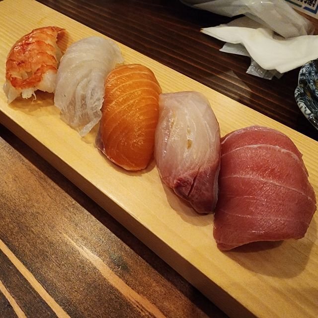 とりあえずお腹を落ち着かせようと「握り盛り合わせおまかせ5種」は¥600なり。マグロにカンパチにサーモンに真鯛に海老、な模様。シャリは普通サイズで赤酢を合わせてあり、サイズは若干大きめ。ネタの下には山葵は入っているのですが・・・