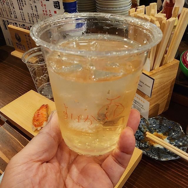 で、生ビールは速攻で制覇し、「ハイボール」¥300にスイッチ。プラカップをお渡しし、入れてもらうわけで。お兄さんがスイカの絵を書いてくれたのに気が付きました。だはは。