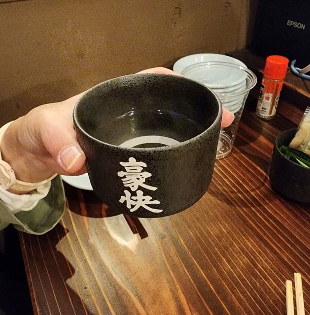 相方は焼酎のお湯割りを所望。お湯なので流石にプラカップではなくて、こういうデッカイお猪口型コップで提供する形。とはいえ200ccぐらい。2階席もありまして、そちらは突き出しアリの座り呑みのようです。