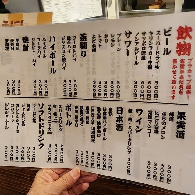 で、時はまだ18:30ぐらいなのですが、2人ともいい感じでお腹が減っているので、まずはメニューに目が行くわけで。飲み物類は「生ビール」¥300(税別価格です)の立ち飲み店価格で・・・・