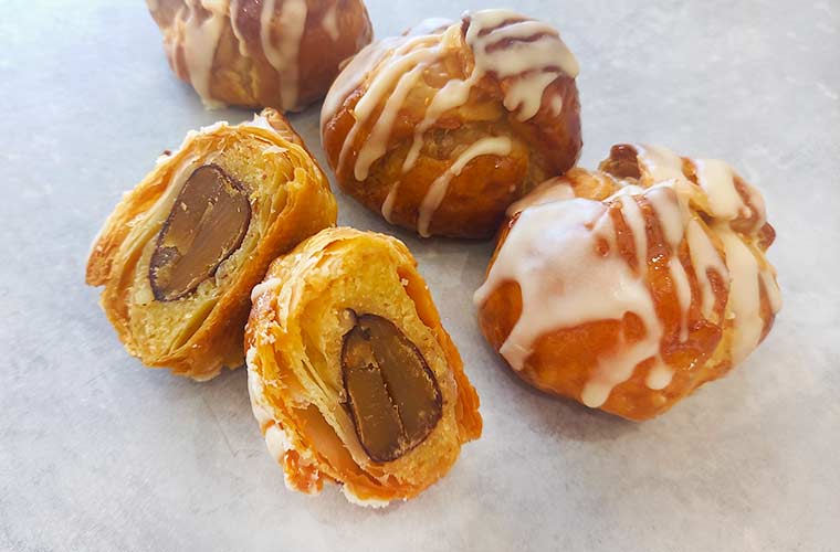 連日完売する大人気商品『ヒナカヌレ』が、イートイン限定で栗渋皮煮の帽子を被って秋らしく衣装チェンジ。同店のカヌレはラム酒を使っていないため、クセのない親しみやすい味わいが特徴です。そこにマロンクリームと栗の渋皮煮をプラス。栗のこっくりとした風味を自慢のカヌレの香ばしい味わいと一緒に満喫して。