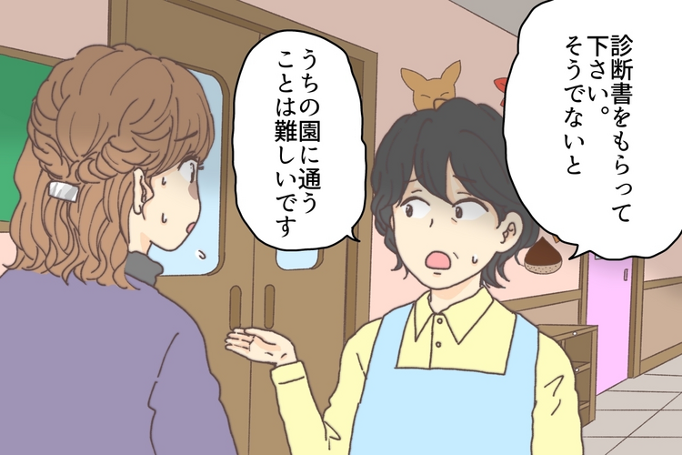 「息子さんの今の様子をお母さんはどう思っていますか?明らかにほかのお子さんたちと違うと思いませんか?」「診断書をもらってください。そうでないと、うちの園に通うことは難しいです」と告げられました。
