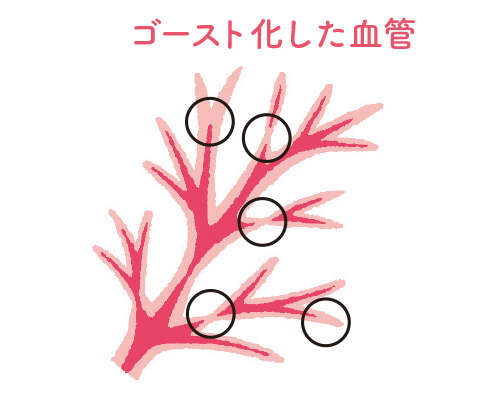 血液が流れなくなり、衰えて消えた毛細血管のこと。毛細血管は全身の血管の多くを占め、体のすみずみまで酸素や栄養を届ける重要な役割を担います。ですが、太さ0.01mmの微細な血管なので、年齢を経るごとに衰えて消失し、その状態を「ゴースト化」といいます。