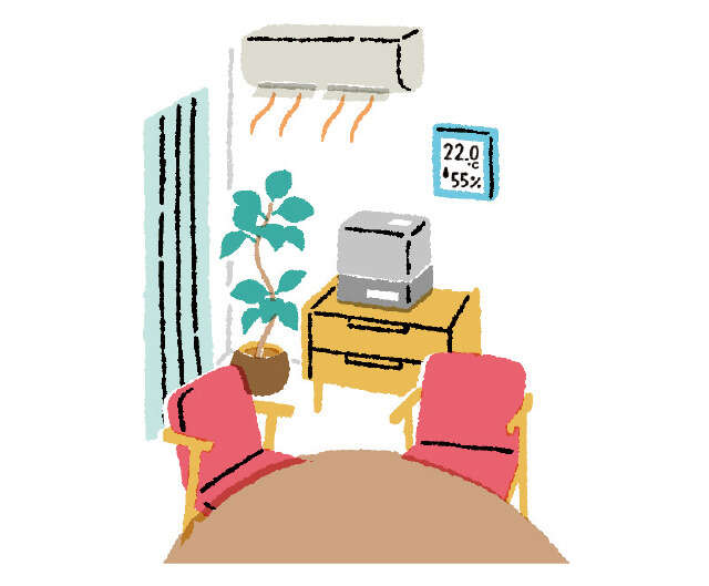 エアコンを使う場合、羽根の向きは下向きにし、暖かい空気を下へ。サーキュレーターで空気を循環させると、部屋全体が均等に暖まります。「部屋が暖まると湿度が下がり、肌が乾燥する原因に。加湿器を併用しましょう」