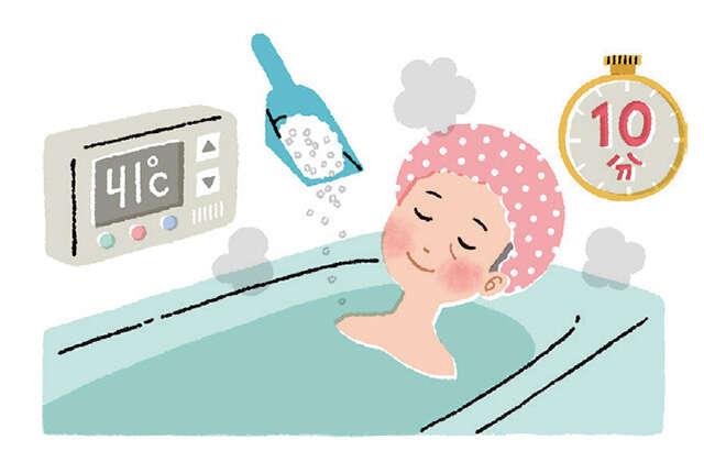 湯船に入ると毛細血管が広がり、血液が循環。天然塩をひとつかみ入れると、ミネラル分が体を芯から温め、肌にベールを作って保湿・保温効果も。長風呂や熱いお湯は逆に乾燥を招くので注意を。入浴後はすぐ保湿しましょう。