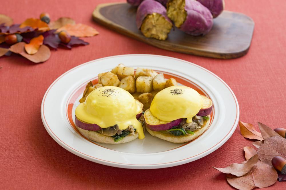 秋の味覚代表「さつまいも」を使ったパンケーキとエッグベネディクト、そしてドリンクが期間限定で登場します。