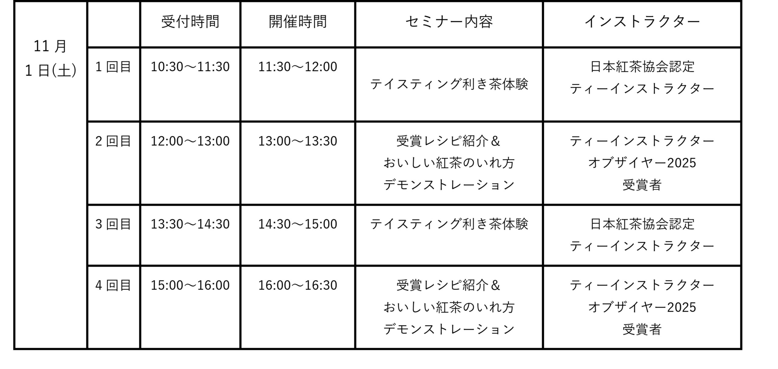 日本紅茶協会では、11月1日を紅茶の日と定め、皆様に紅茶を知っていただくための催しを行っています。今回はティーインストラクター・オブ・ザ・イヤー2025上位受賞者によるデモンストレーションと産地別茶葉飲み比べ利き茶が実施されます。第1回と第3回では、2025年10月12日に開催される「ティーインストラクターオブザイヤー2025」における上位受賞者による受賞レシピを紹介。また美味しい紅茶の入れ方のデモンストレーションも実施されます。