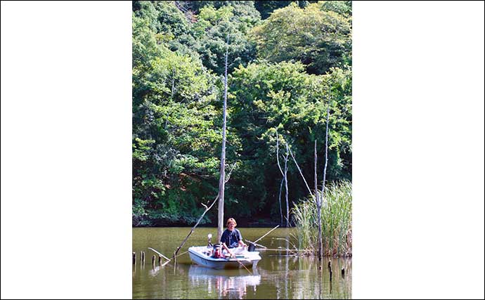 そもそも黒滝ってどこって話だが、もっとも近い舟宿はレンタルボート笹川になる。ボート桟橋を離れ東上流へ延々と進むと、やがて幻想的な立ち木群が出現する。このエリア一帯を通称・黒滝と釣り人は呼称する。