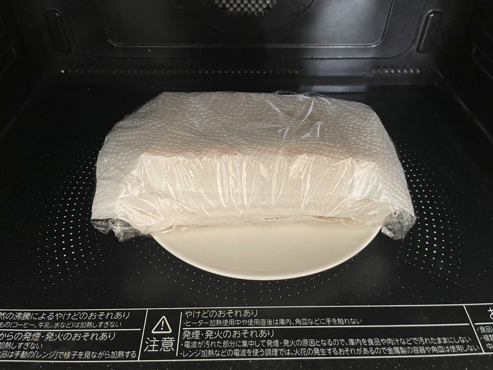 2.全体をラップで包み、耐熱皿にのせて電子レンジ600Wで30秒(500Wの場合は40秒)加熱します。