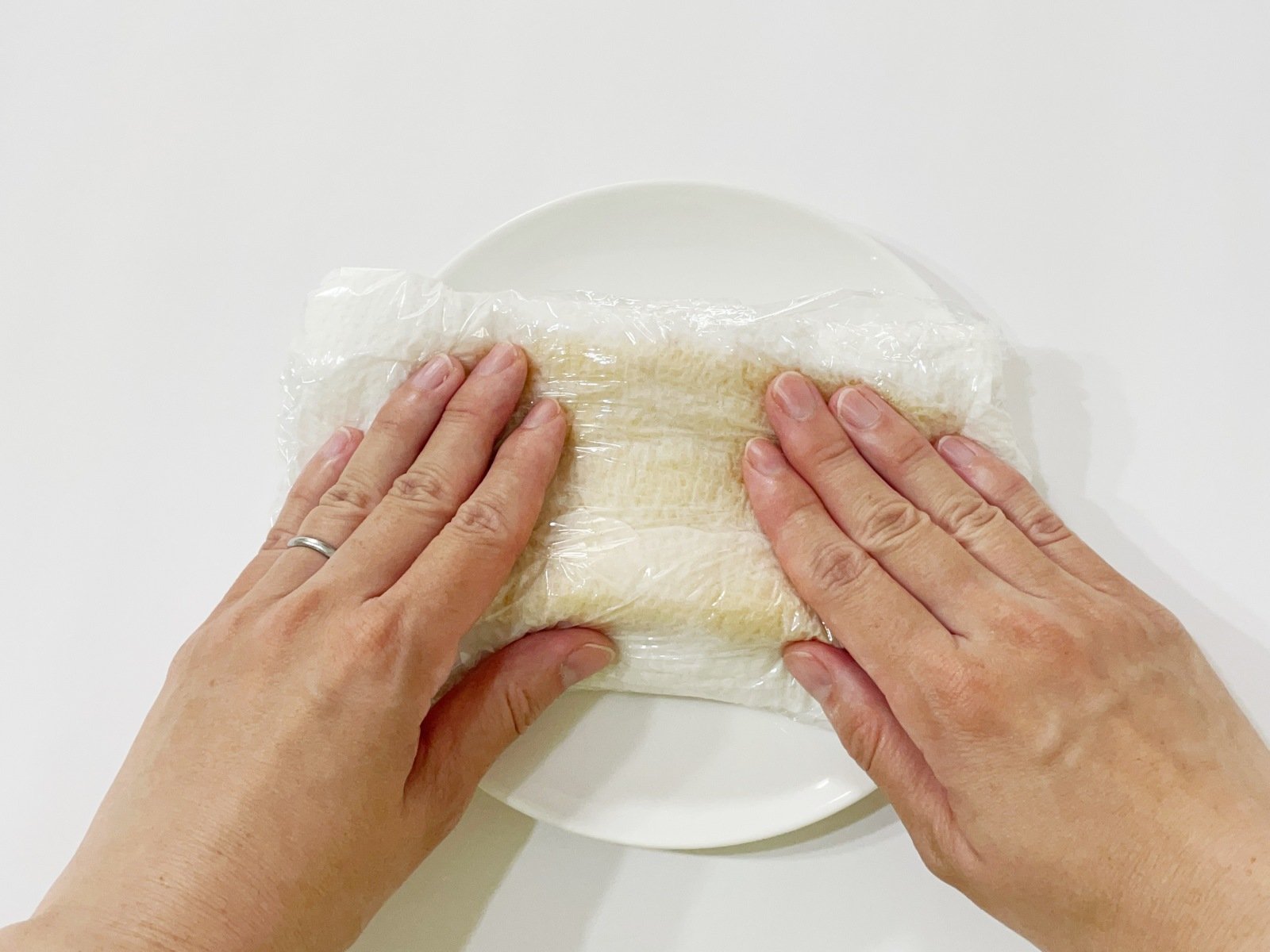 3.ラップの上から手でギュッと全体を押さえ、キッチンペーパーで油を吸い取ります。加熱後すぐは熱いため、少し冷ましてからヤケドしないように注意して行ってください。