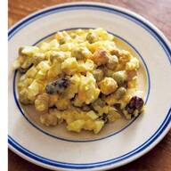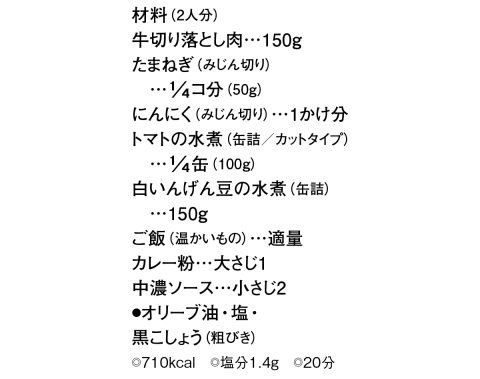 2 カレー粉を加えて軽く炒め、水カップ1、トマトの水煮、汁けをきった白いんげん豆の水煮、中濃ソース、塩小さじ1/3、黒こしょう少々を加える。煮立ったら弱火にし、煮汁がほとんどなくなるまで10分間ほど煮る。