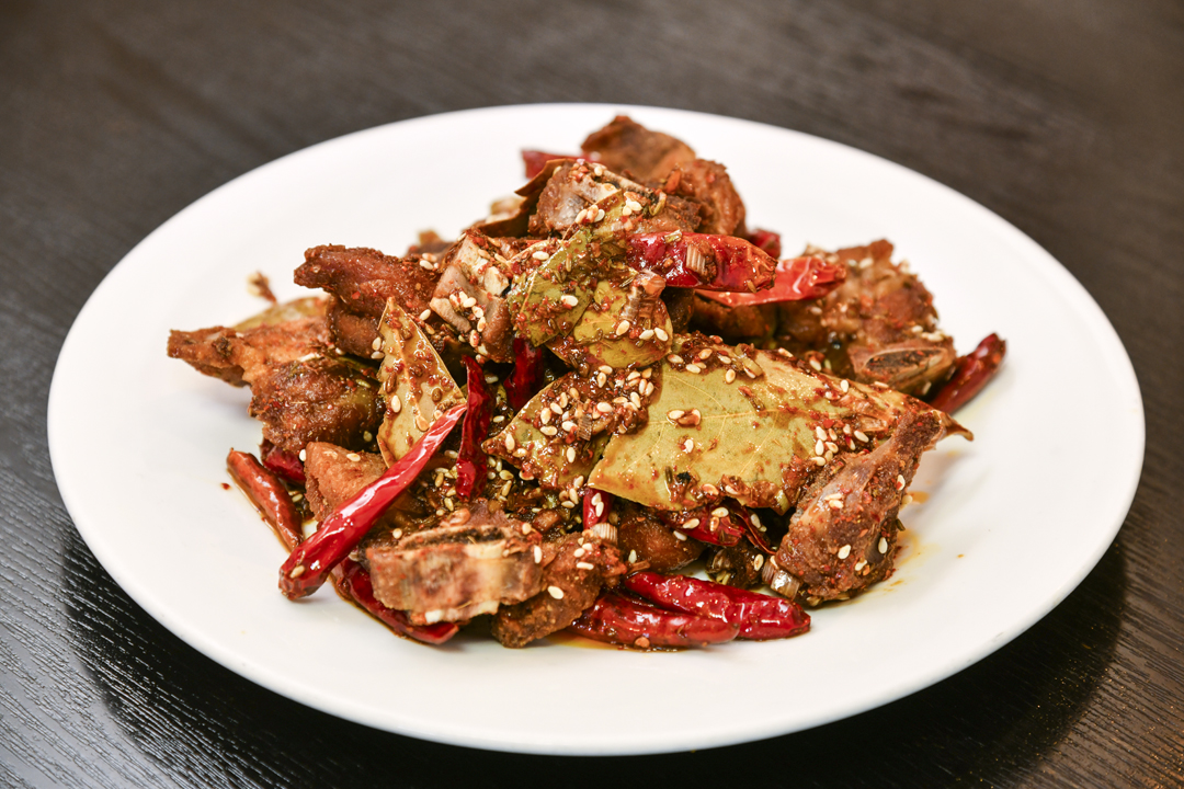 この見た目に、「どんな味?」という好奇心と“スパイス欲”を刺激される逸品。スパイス入りの老抽王(中国のたまり醤油)などで甘辛く味付けしたスペアリブを、ローリエとクミン、唐辛子と一緒に炒め合わせている。クミンの風味と唐辛子の辛さ、そしてスペアリブの旨みが余韻を残すコク深い味わい。ゴマの風味も良いアクセントに。絶妙な火加減で脂身がカリカリになったスペアリブを、指までしゃぶりながら食べたい。気軽につまめる一口サイズがまた絶妙!黒生ビールのお供にピッタリの一皿。