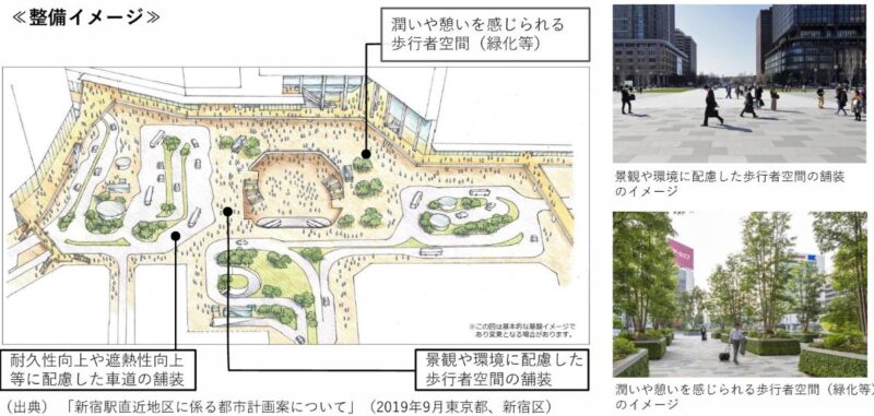 東京都も2025年7月4日、新宿駅西口駅前広場の車両・歩行者動線を抜本的に見直す再整備計画を発表しました。2025年9月末から本格的な改修に入り、世界最多の利用者数を誇る新宿駅周辺を「人中心の都市空間」へと再構築するとしています。改修後は、西口駅前広場を南北に通り抜けていた一般車の走行が不可となる一方、う回ルートや一時退避スペースを整えることで交通滞留を抑える方針です。歩行者の利便性は大きく向上し、これまで小田急HALCや京王百貨店側まで迂回していた西新宿方面への移動が直進で可能になります。新設デッキや吹き抜け構造により、車道と歩行者導線が完全分離され、安全性向上も期待されています。