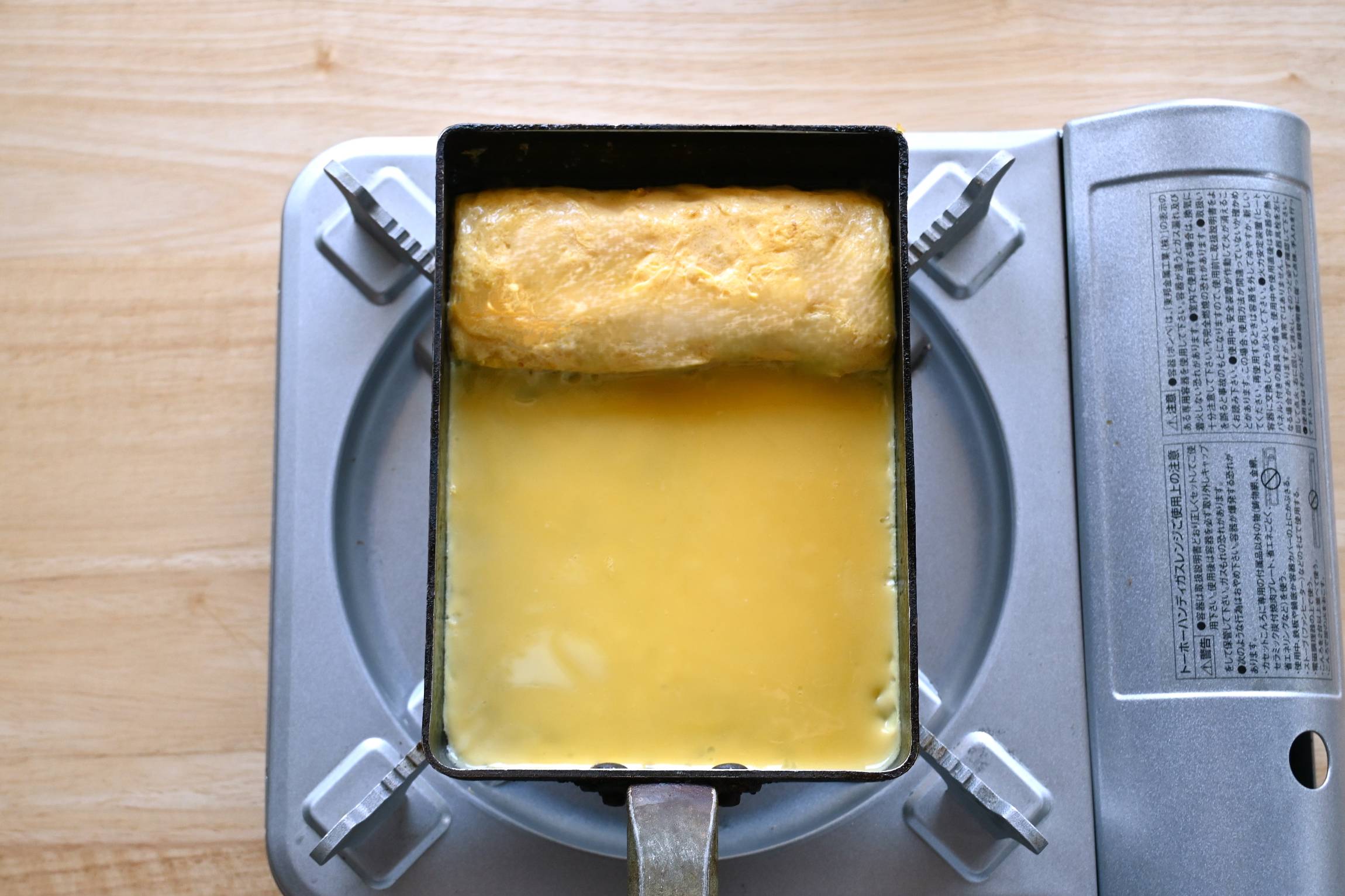 卵液を再度かき混ぜて空いたところに卵液を注ぎ入れ、焼けた卵の下にも流し入れます。