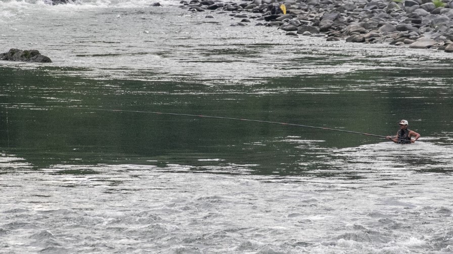 松谷村長は齋藤誠司さんのサポートを受けながら3尾をキャッチ