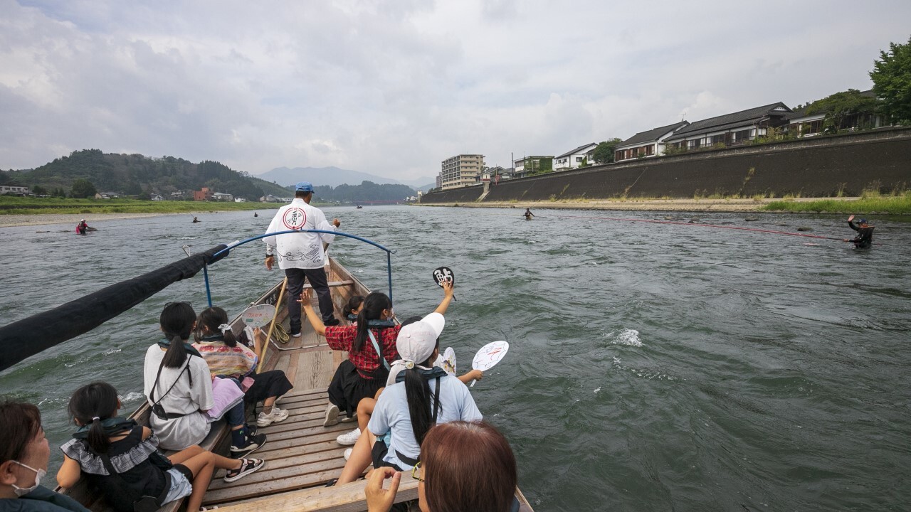 早々に掛けたのは競技委員長の野嶋玉造さん。「自分を育ててくれた球磨川に恩返しがしたい」と、本大会にかける想いが人一倍熱い発起人のひとりだ。 会場全体を見て回れば、朝のうちはまばらだった釣果も、日が高くなるにつれてサオが満月にしなる豪快なやり取りが各所で見られるようになった。 予選中には、人吉市の社会福祉法人「ひだまり」が地元の小学生を集め、球磨川くだりの舟から選手たちに声援を送った。「大きいアユを釣ってください!」「がんばってください!」と子どもたちの声援に応え、選手たちもにこやかに手を振って返す。まさに市民の温かな歓迎に包まれる大会となった。