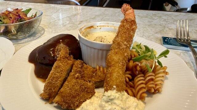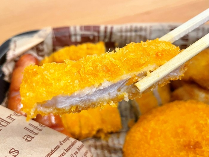 ソーセージ、クリームコロッケ(カニ入り)、その下には大正義ロースカツが横たわる。