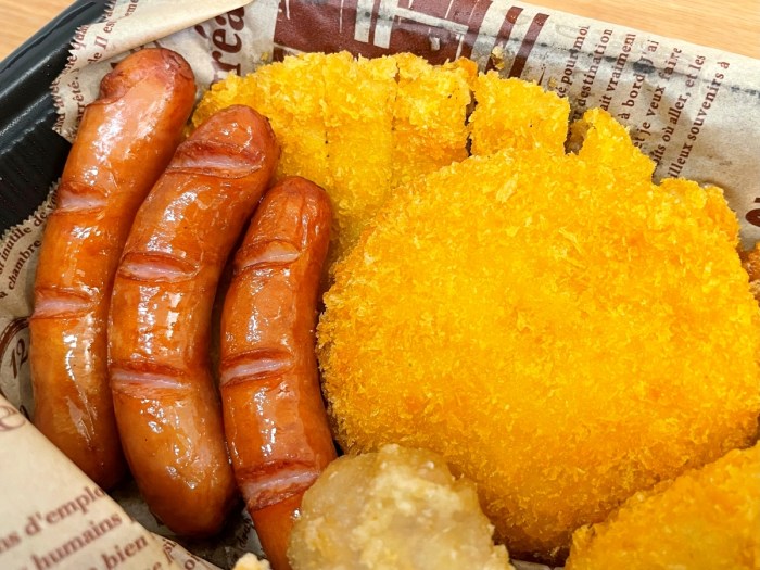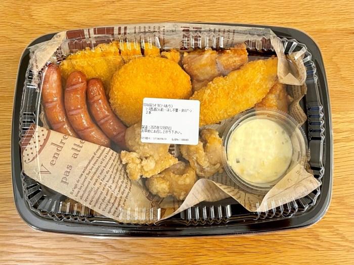 Bセット(税込1280円):ロースカツ、パリパリチキン、ソーセージ(3本)、フライドチキン(3個)、フィッシュフライ、クリームコロッケ(カニ入り)、クリーミータルタルソース