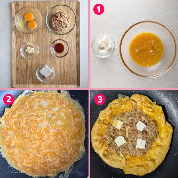 ③ 弱火にし、②の中央に納豆をのせ、さらにその上にクリームチーズを散らす。卵を少し中心に寄せるように形を整え、ふたをして2〜3分蒸す。チーズがやわらかくなったら、完成!
