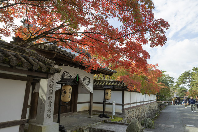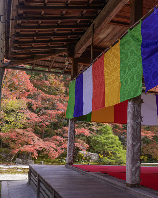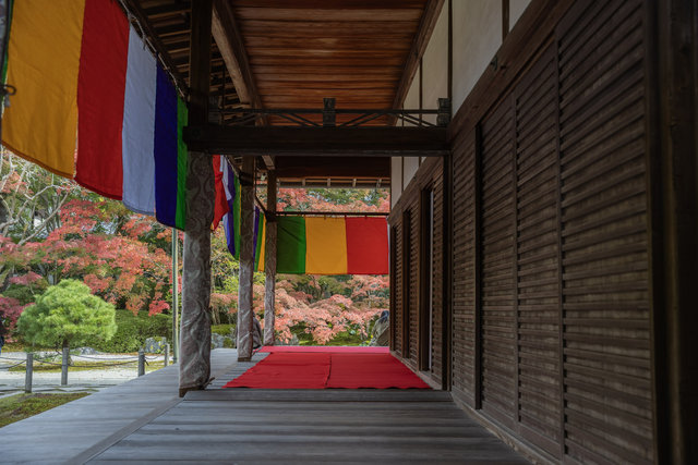 南禅寺の中でも、早期に見頃を迎える塔頭寺院の「天授庵」です。この日は法要で、寺幕や五色幕が掛かっていて、より華やかです。