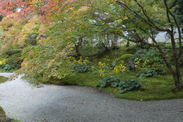 紅葉が色付く時期によく見かける黄色い花は、「石蕗つわぶき」と言います。南禅寺の境内に点在していて、天授庵にも紅葉のそばに密集して咲いています。