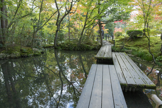 東庭と南庭の間にある池に架かる、八つ橋です。こちらの紅葉は色付きが遅く、ほとんど青葉でした。東庭の紅葉と時間差があるようです。木々が鏡面のように映り込む風景が、美しかったです。