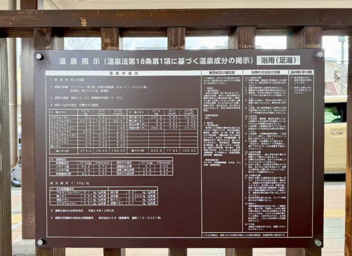 地下1,000mから湧出する温泉の泉質は、「ナトリウム-塩化物・炭酸水素塩泉」、足湯の温度は42.5度(調査時の気温13.9度)と書かれています。