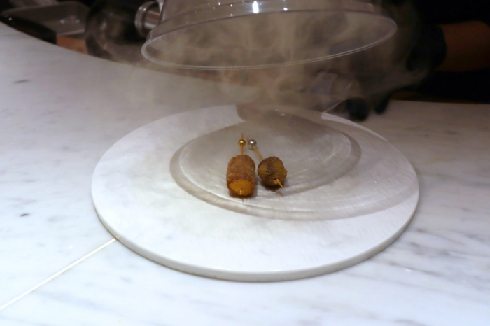 料理はまだまだ、終わりではありません。「チーズ」と「うずらの卵」は桜のチップで燻製に。